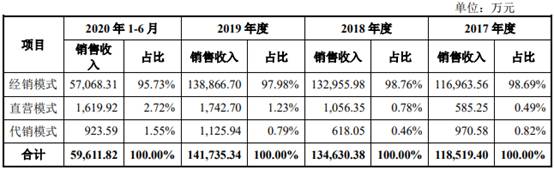 欢乐家依赖经销模式。2020年上半年,公司开展合作的签约经销商数量为1448家;报告期内,公司经销收入分别为11.70亿元、13.30亿元、13.89亿元和5.71亿元,占当期主营业务收入的比例分别为98.69%、98.76%、97.98%和95.73%。