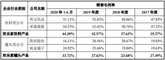 报告期内,欢乐家饮料产品毛利率分别为35.37%、37.63%、42.57%、44.20%,低于饮料类公司养元饮品、承德露露的毛利率;欢乐家罐头产品毛利率分别为27.49%、23.68%、27.63%、33.72%,高于罐头类公司凯欣股份、林家铺子的毛利率。