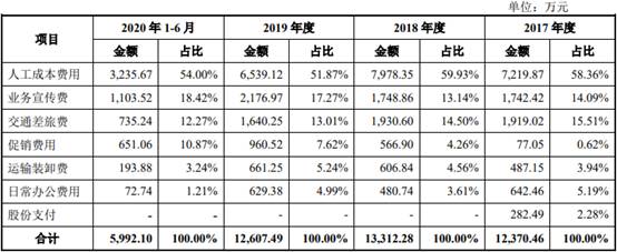 2017年至2020年1-6月,欢乐家销售费用率分别为10.35%、9.83%、8.85%和10.02%,同行上市公司销售费用率平均值分别为10.36%、11.98%、12.36%、13.64%。