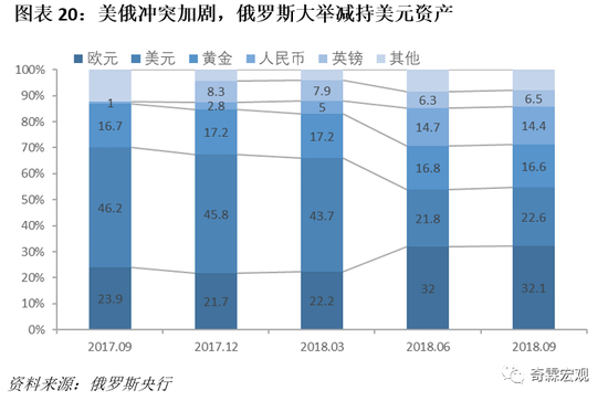 以中美俄三方为例,2018年美俄冲突加剧,美国针对俄罗斯实施了一系列经济制裁措施,相应的俄罗斯则通过大规模减持美元资产来应对美国的经济制裁。而在俄罗斯减持美国资产后,俄罗斯央行开始大幅度增加在人民币资产上的配置,可以看到俄罗斯央行持有的人民币资产从2017年末的2.8%快速增长到2018年6月的14.7%。