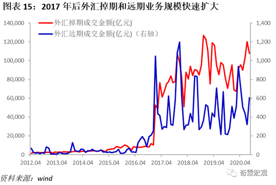 随着制度的完善,可以看到在2017年之后,外汇市场上的外汇掉期、远期业务量均出现了爆发式的增长,特别是外汇掉期业务规模快速扩张到每个月接近8万亿的水平。较大的外汇掉期业务确保了境外机构投资者能够在外汇市场上较好的管理外汇头寸。