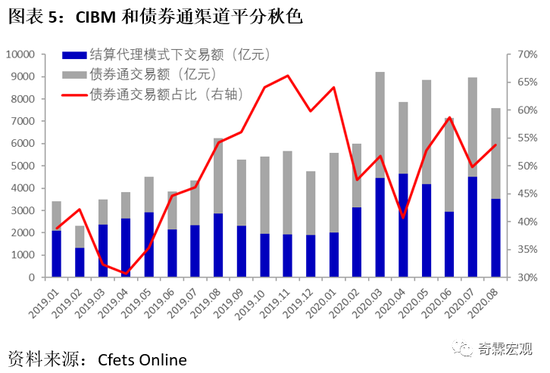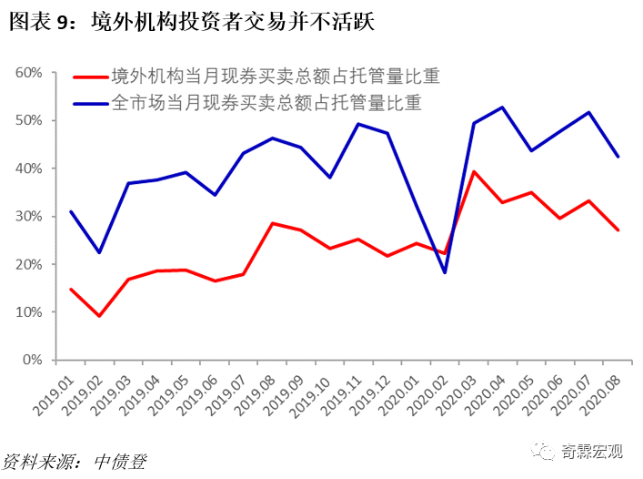 从交易规模上来看,2020年8月境外机构共达成现券交易6678亿元,交易量占市场总成交量的2.2%,交易规模较小,在市场上的存在感不强。