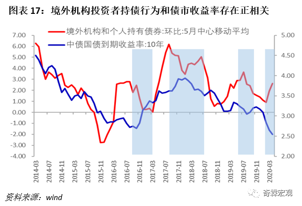 我们从数据上可以看到,在2016年之前,境外机构持债增速与国债收益率之间存在明显的正相关。这是因为当时只有央行类机构被批准直接参与到银行间债券市场,而央行类机构是明显的配置盘,这就使得他们的行为与债市走势呈现出正相关。