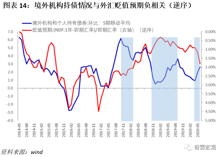 从数据上我们也可以看到人民币贬值预期与境外机构的持债增速呈现出较为明显的反相关关系。