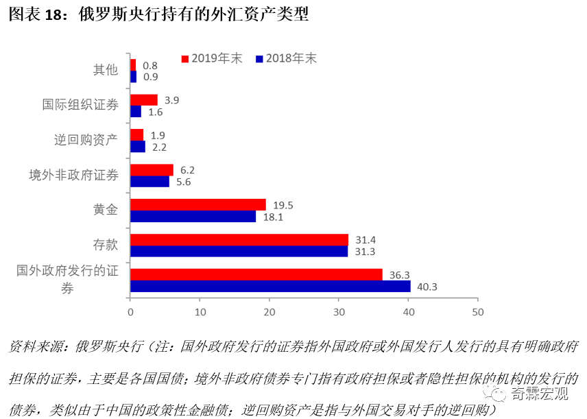 以俄罗斯央行为例,外国政府发行的证券(主要是各国国债)在俄罗斯央行境外资产中占比最高,2018年的占比为40.3%,2019年末略微下滑到36.3%;存款是俄罗斯央行持有的第二大类资产,近两年占比稳定在31%的水平。另外,俄罗斯央行虽然会持有非政府证券,但是这类非政府证券一般都是有政府担保或者隐性担保的证券,类似于中国的政策性银行债,2019年俄罗斯持有该证券的比重为6.2%,相比于2018年上涨了0.6%。
