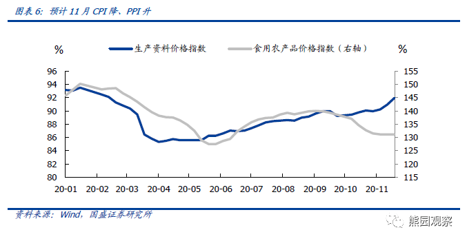 展望四季度,CPI:预计11月食品环比继续下降,带动CPI同比回落至0%附近,12月延续低位。PPI:截至11月20日生产资料价格指数环比上涨1.38%,对应PPI环比有望上涨0.3%左右,PPI同比升至-1.7%附近,12月有望继续小升。