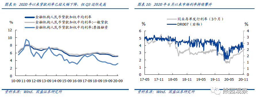 一是贷款加权平均利率。根据我们测算,金融机构让利1.5万亿的任务需贷款加权平均利率降低50BP左右。截至2020年9月末,金融机构贷款加权平均利率为5.12%,较2019年底下降32BP;其中,一般贷款加权平均利率为5.31%较2019年底下行43BP;企业贷款加权平均利率为4.63%,较2019年底下降49BP。由此来看,贷款利率下行幅度较大,反映了近期再降息必要性不大。《报告》指出截至10月末,已实现让利1.25万亿元,全年可实现1.5万亿目标也反映了这一点。
