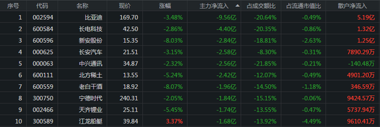 比亚迪、长电科技、新安股份分别遭主力资金卖出9.56亿元、4.40亿元、2.84亿元。