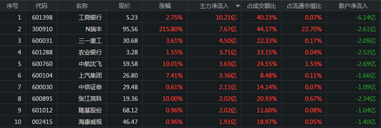 从个股来看,主力资金最青睐的3只股票分别是工商银行、N瑞丰、三一重工,流入金额分别为10.21亿元、7.67亿元、4.50亿元,所对应的涨幅分别为2.75%、215.80%、3.61%。