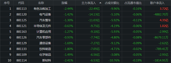 主力资金流出的板块分别是有色冶炼、电气设备、汽车整车,主力资金流出金额分别为22.49亿元、14.13亿元、11.03亿元,其中散户净流入金额为3.72亿元、-4882.70万元、4.35亿元。