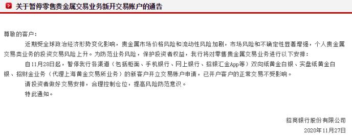 招行银行公告称,自11月28日起,暂停我行各渠道双向纸黄金白银、实盘纸黄金白银、招财金业务的新客户开立交易账户申请,已开户客户的正常交易不受影响。
