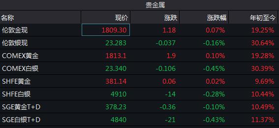 今日贵金属市场整体波动不大。截至记者发稿时,伦敦现货金收报1809.3美元,微涨0.07%;COMEX黄金主力合约收报1813.1美元/盎司,微涨0.1%。伦敦现货银下跌0.16%,报23.283美元/盎司,COMEX白银主力合约下跌0.45%,报23.34美元/盎司。