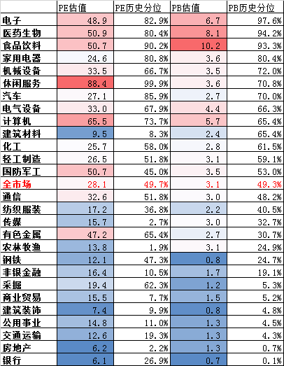 食品饮料业大市值股票估值水平不断抬升,房地产下降