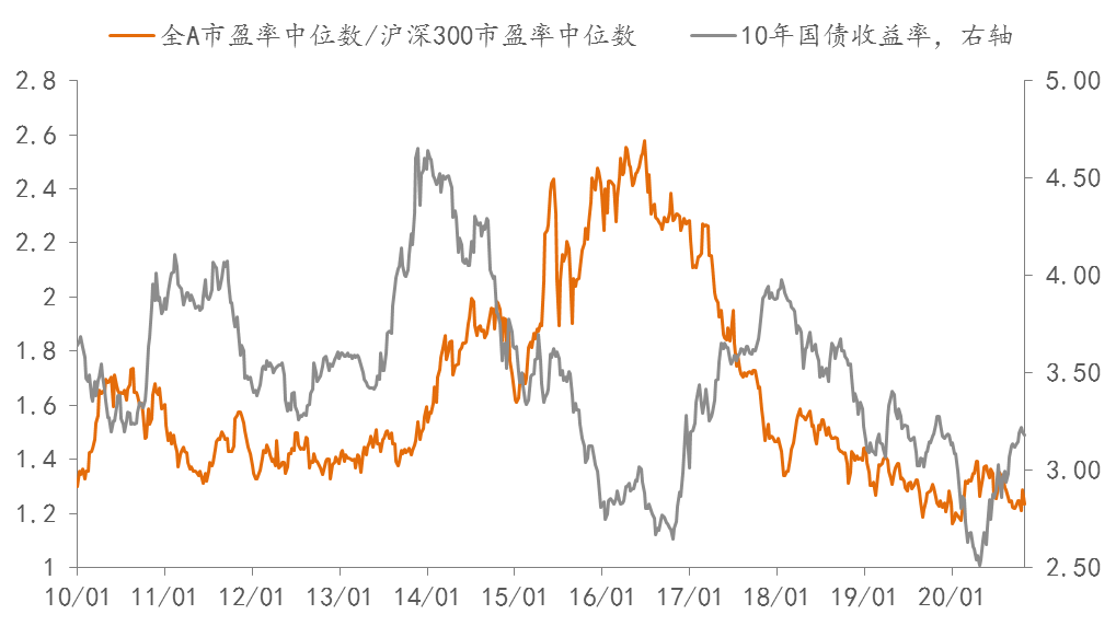 如今,结构性行情仍在继续,还将持续多久呢?我们常用全市场估值中位数与沪深300成分的估值中位数比值来衡量市场风格,比值上升表示市场风格小盘占优,反之代表大盘股占优。
