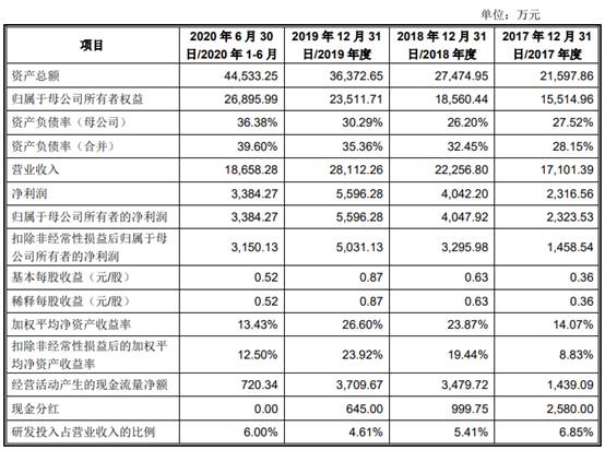 2017年至2020年上半年,公司营业收入分别为17,101.39万元、22,256.80万元、28,112.26万元和18,658.28万元,净利润分别为2316.56万元、4042.20万元、5596.28万元和3384.27万元,