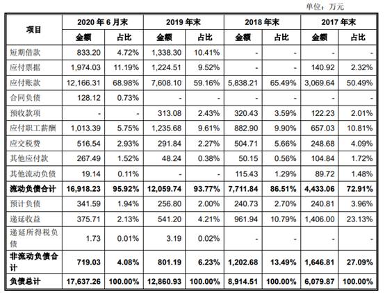 2017年至2020年上半年各期末,正弦电气的负债总额分别为6079.87万元、8914.51万元、12,860.93万元和17,637.26万元,公司流动负债余额分别为4433.06万元、7711.84万元、12,059.74万元和16,918.23万元,占总负债的比例分别为72.91%、86.51%、93.77%和95.92%。