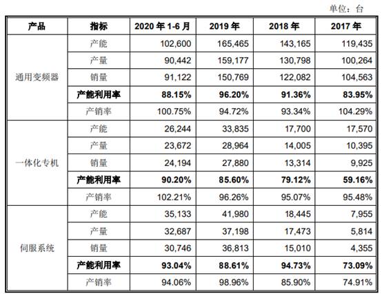 2017年至2020年上半年,正弦电气通用变频器的年产能分别为119,435台、143,165台、165,465台和102,600台,产能利用率分别为83.95%、91.36%、96.20%和88.15%;一体化专机产能分别为17,570台、17,700台、33,835台和26,244台,产能利用率分别为59.16%、79.12%、85.60%和60.20%;伺服系统产能分别为7955台、18,445台、41,980台和35,133台,产能利用率分别为73.09%、94.73%、88.61%和93.04%。
