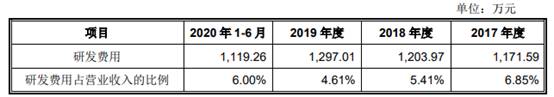 2017年至2020年上半年,正弦电气的研发费用分别为1171.59万元、1203.97万元、1297.01万元和1119.26万元,占营业收入比例分别为6.85%、5.41%、4.61%和6.00%。
