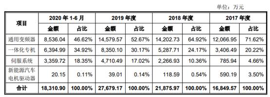 正弦电气的主要收入来源于变频器、一体化专机、伺服系统产品。2017年至2020年上半年,通用变频器的销售收入占比71.62%、64.92%、52.67%和46.62%,一体化专机销售占比20.22%、24.17%、30.17%和34.92%,伺服系统销售占比4.66%、10.36%、17.02%和18.35%。
