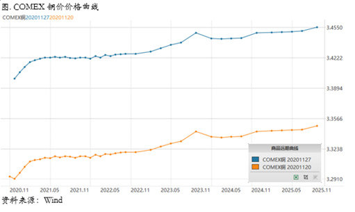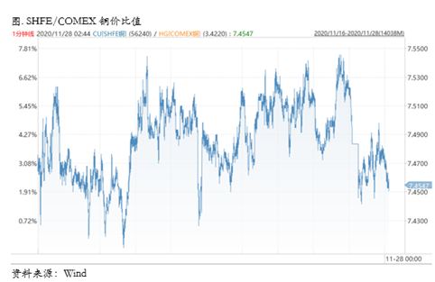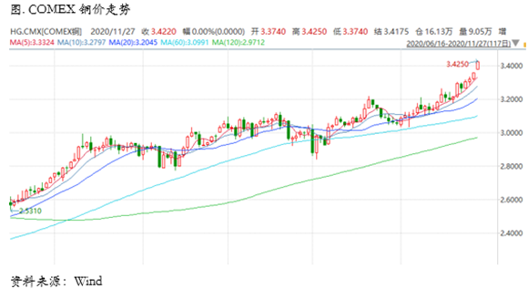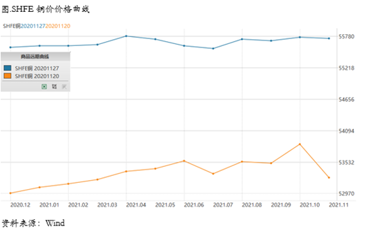 上周铜价维持强势格局,周一铜价震荡运行,日间时段基本在狭窄的区间内波动,在此前的大涨之后,需要一段时间来对涨幅进行消化,晚间时段美国PMI好于预期和前值,使得美元指数日内强劲拉升,对铜价形成了一定打压,但在美元日内拉升结束之后,由于数据本身表现抢眼,以及疫苗再次传来好消息,市场风险偏好升温,铜价收复了日内跌幅,全天以震荡格局走完;周二铜价显著反弹,日间时段下午出现了显著拉涨,我们认为仍然是看多铜价的人在买入,至晚间时段,铜价转入高位震荡,但整体市场情绪依然偏正面;周三铜价先抑后扬,日间时段铜价再次创出近期新高后开始震荡回落,亚洲地区权益市场表现偏弱也对市场情绪带来了一定打压,晚间时段进来之后,密集公布了美国众多宏观数据,诸如新订单、批发库存、新屋销售、初请失业金等指标均与预期基本符合,显示美国经济复苏势头依然可观,而11月FOMC决议整体依然中性,美元持续回落,也推升铜价的上行;周四铜价再度上涨,宏观面全天较为平静,这给了多头一个相对有利的氛围继续看多铜价,在弱势美元以及积极的经济预期的推动下,铜价继续走高,再次刷新近期高点;周五铜价,日间时段中国规上工业企业利润数据表现良好,铜价继续逐渐上行,晚间时段市场依然处于riskon之中,风险资产普遍上扬,铜价继续创出近来新高。