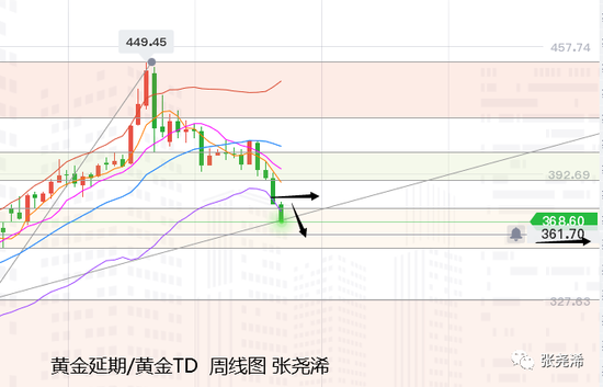 黄金TD:金价上周收于377.31元,周振幅15.77元,收跌13.41元,幅度3.43%。本周一延续其上周五晚盘开盘377.31元/克而继续承压走低,虽未再度刷新低点370.80元,但指标信号上的空头信号也未得到减弱,故此也并排除将有进一步下探的风险。