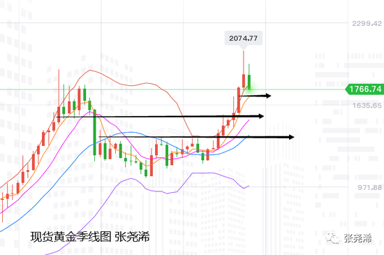 综合来看,抛开这些因素,单看美国10年期国债收益率,长期趋势偏向下行,目前的短线反弹则对金价产生压力,但上方也面临阻力,如直接触及初步阻力1.8附近产生下挫,金价将会在1700美元附近得到长期支撑,进而再度走高,如延续至进一步阻力2关口上方则是对应金价在1500美元附近得到长期支撑。所以短线操作,我不排除其空间利润,长期操作,我则会在据此两大支撑选择进入。具体到点位上,可以参考1760/50美元附近,以及1520美元入场,空间可看到500美元左右的幅度。再较为具体的分析则参考文末技术面的季度线观点。