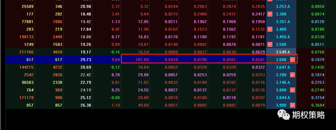 值得注意的是,50ETF除权后,昨日新加挂了标准合约,开盘标准合约的认购涨幅,显著高于非标准除权后带A的合约。尤其是12月认购3600,在9点31分,一笔399张的买单,直接给拉到107%涨幅,触发盘中熔断,全天再也没涨回去了。心疼这位大哥两分钟,遇到大涨追单千万不要慌,期权更不建议用市价追单。