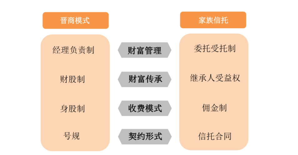 从晋商的经营管理制度与现代信托的对比中可以看到,晋商管理家族产业的思想和方法已经十分接近于现代家族信托:晋商的掌柜类似于信托的受托人,代替委托人经营家族财产;东家类似于信托的委托人,不参与家族财产的管理,但可以任命受托人;晋商的财股和身股制度,类似于信托受益人的受益权和受托人的收费方式,受益人通过受益权获得家族财产经营获得的红利,相当于持有财股;受托人收取管理费,相当于持有身股;晋商的号规,与信托合同类似,受托人和委托人签订合同后,受托人应按照合同规定对家族财产进行管理、对管理收益进行分配。这套先进的制度,是晋商家族成功经营和完整传承的重要因素之一。