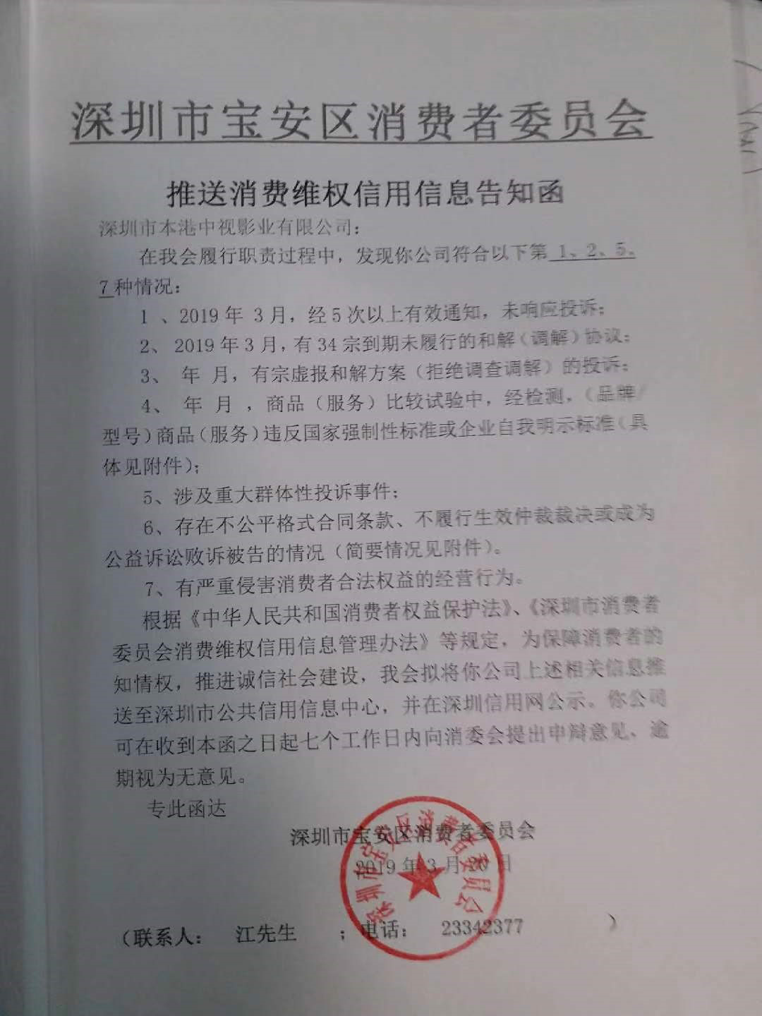 2019年3月20日,宝安区消委会向本港中视公司发出了《推送消费维权信用信息告知函》,将本港中视公司严重侵害消费者合法权益的经营行为等相关信息推送至深圳市公共信用信息中心,并在深圳信用网公示。