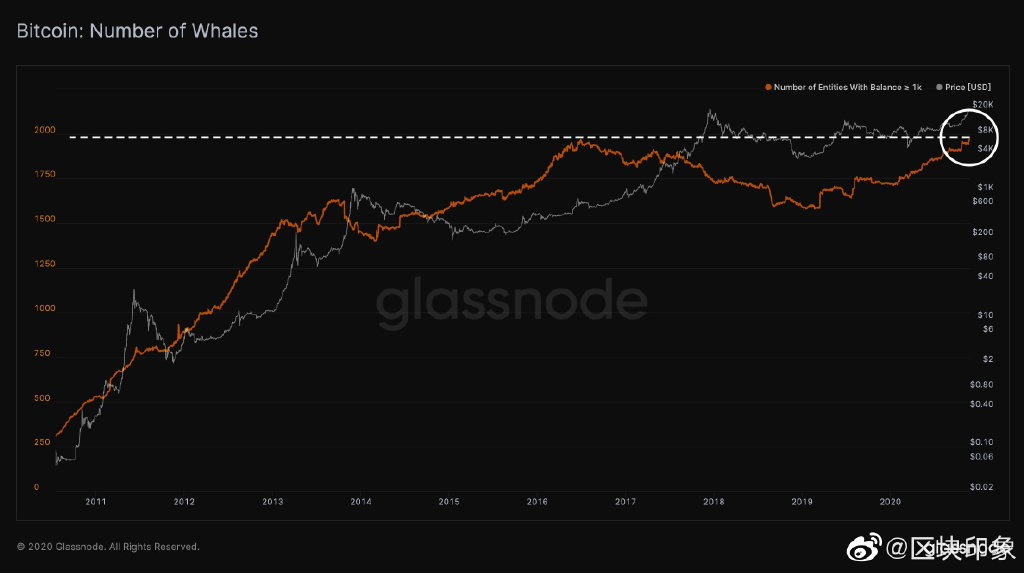 与此同时,持有1000枚比特币的地址超过2000个,上一次出现这个数据还是在2016年——比特币不断被聚集,直到2017年那波牛市,大量散户入场,打破财富的集中程度。