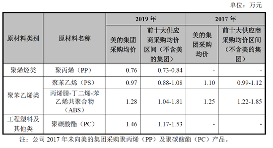 2017年和2019年,公司向美的集团采购原材料的金额分别为158.40万元和17,988.26万元,占当年采购总额的比例分别为0.10%和5.31%,占比较低。公司向美的集团采购的原材料均按照市场化的原则定价。报告期内,公司向美的集团采购原材料均价与向报告期内前十大供应商(不含美的集团)采购均价区间的对比情况如下: