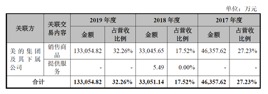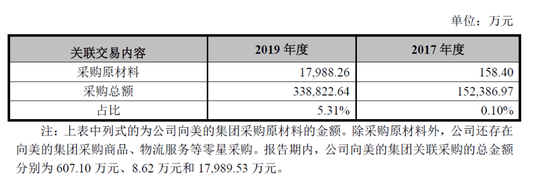 报告期内,公司向美的集团关联采购金额分别为607.10万元,8.62万元和17,989.53万元,占营业成本的比例分别为0.42%、0.01%和5.08%,占比较低。2019年,公司向美的集团关联采购金额较大,主要系美的集团自2019年开始建议其供应商通过美的集团采购中心采购树脂类原材料,上述建议不具有强制性。公司综合考虑原材料采购价格、供货情况等因素,通过美的集团采购中心采购了少量原材料。