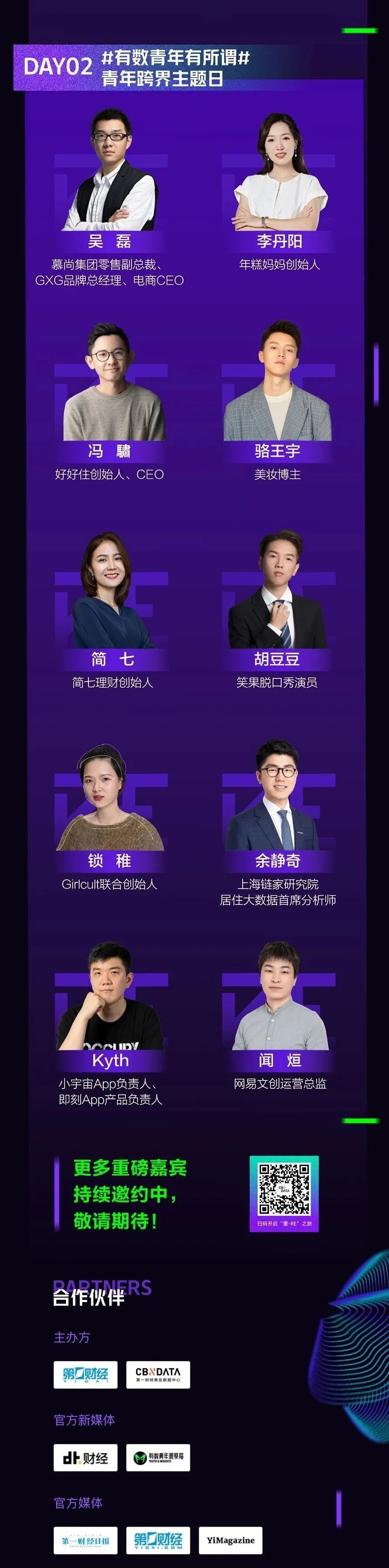 此外,2020第一财经数据盛典第二天还将首次迎来“有数青年有所谓”青年跨界论坛,我们将联动互联网红人/新兴品牌/潮流IP,聚焦当代青年对消费、生活和对精神世界的洞察思考。