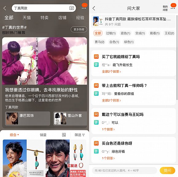 左:淘宝的丁真搜索结果。右:丁真同款耳饰下的评论