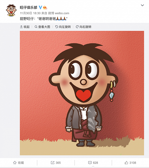 现在,丁真戴着藏族松石耳饰、穿着民族服装的外形也被符号化,成了品牌借势营销的对象。旺旺微博账号“旺仔俱乐部”在11月30日发布了一张照片,将旺仔打扮成了一张照片中丁真的样子,叫自己“甜野旺仔”,对应丁真在互联网上“甜野男孩”的称号。在该条微博讨论区,有不少网友邀请旺旺请丁真代言,或者推出联名手办盲盒。
