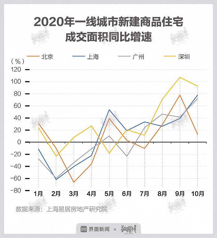 从增速上来看,自6月起,深圳新建商品住宅成交面积持续保持同比上涨。其中,9月同比涨幅达到107%,远超北京、上海及广州。