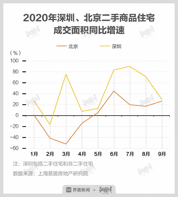在二手商品住宅方面,今年以来,深圳二手商品住宅成交面积同比增速始终高于北京,单月最大同比涨幅近90%。