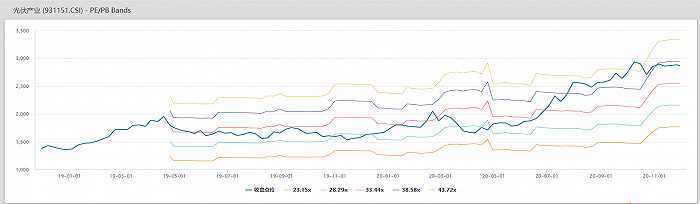 光伏行业目前的估值处于历史高位。通过Wind市盈率通道可以看出,光伏产业的合理估值应该在33倍左右,而目前38倍左右的市盈率显然处于过热的状态。
