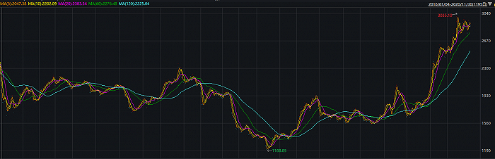 光伏行业近几年来充分享受其顺周期特性。2019年以来,受益海外市场份额的持续增长以及新光伏政策出炉,光伏行业开始凭借自身经济性走向能源核心舞台,行业景气度持续走高至今。这一点可以从光伏产业指数优异的表现中得到佐证。数据显示,其指数点位已经由2018年低点的1188点上涨至如今的2870点,涨幅高达141.58%。而同期沪深300指数仅上涨62.94%。