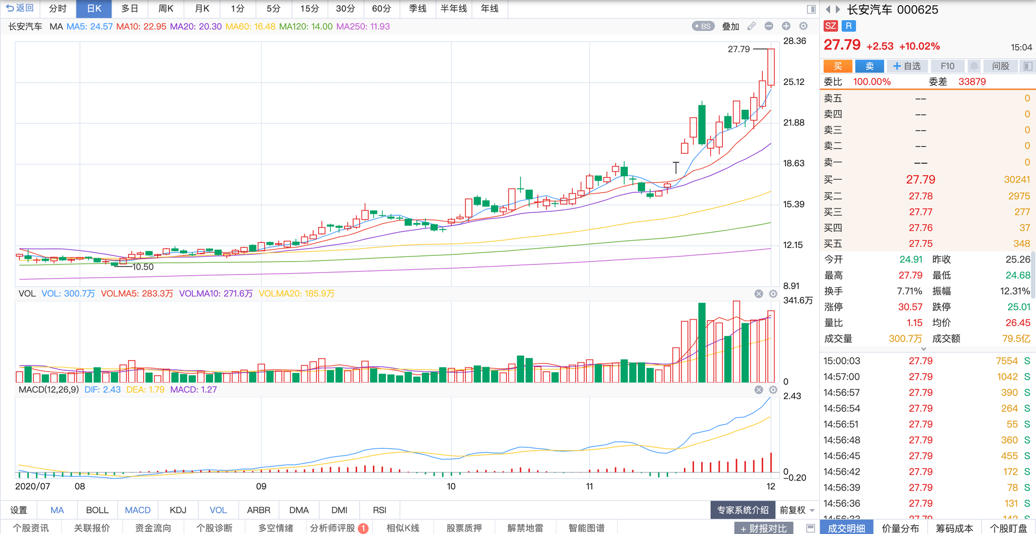 股价方面,长安汽车今年下半年开启趋势性上涨行情,自今年6月以来已连续6个月上涨,特别是11月,长安汽车股价当月涨幅高达52.91%。而12月的首个交易日,公司股价再度涨停,最新报27.79元,续创历史新高。以此计算,长安汽车今年下半年以来区间涨幅已超过180%。