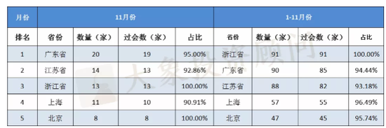2020年11月、1-11月上会企业地域分布前五名: