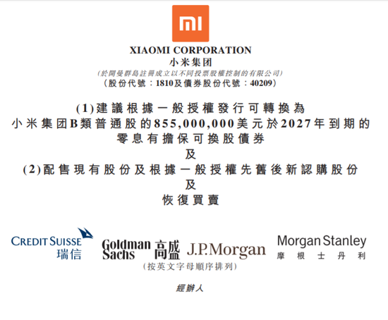 于2020年12月1日(交易时段后),发行人Xiaomi Best Time International Limited(公司全资附属公司)及公司与经办人订立可换股债券认购协议,据此,按照可换股债券认购协议的条款并在其条件规限下,发行人已同意发行债券,公司已同意担保发行人根据条款及条件支付的有关该等债券的所有应付款项,而经办人已同意认购及支付或促使认购人认购及支付本金总额8.55亿美元的债券。
