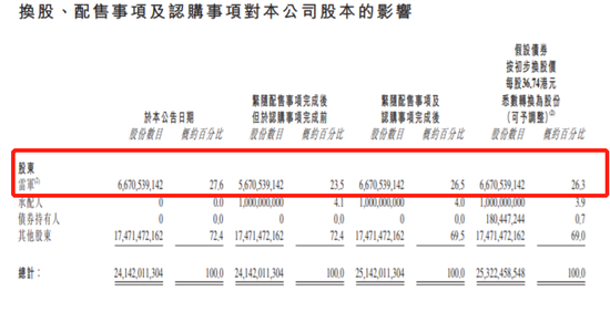 所有事项完成后,雷军持股从27.6%稀释为26.3%。