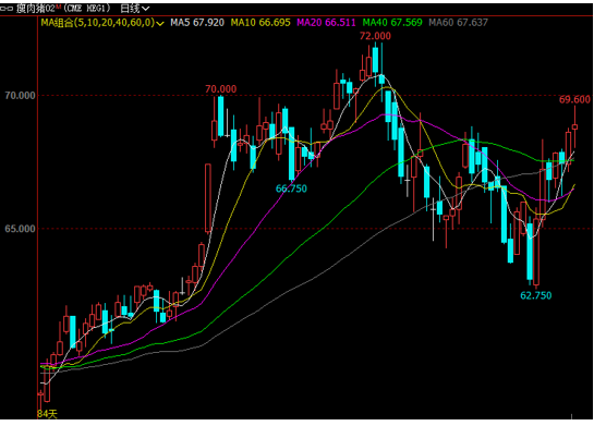 昨晚芝商所旗下CME瘦肉猪期货主力2月合约收报至68.75美分/磅,较11月20日晚的低位阶段性低位62.75美分/磅涨逾9.00%,如下图1。