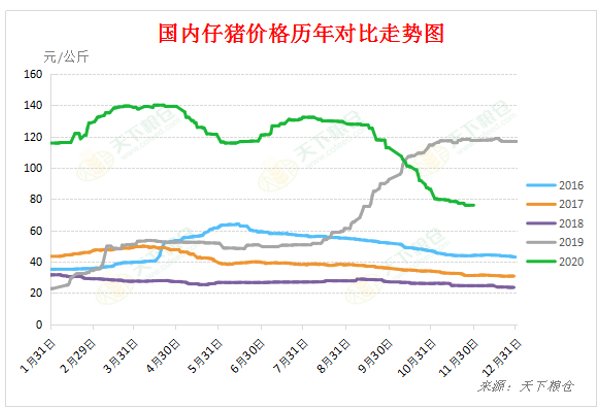 母猪供种能力明显增强,前三季度种猪企业的二元母猪销量同比增长102.6%,新生仔猪供应逐渐宽松,截止11月30日仔猪平均价格为76.06元/公斤,较去年同期的117.45元/公斤下跌了41.39元/公斤,同比跌幅为35.24%。目前生猪产能已经恢复到2017年年末的88%左右。按照生猪生产的周期性规律,明年二季度,全国生猪存栏才将基本恢复到正常年份的水平。