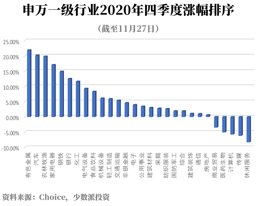 四季度又体现了另一个极端,上半年远远跑输的周期类行业涨幅非常不错,而医药股却排名见底。