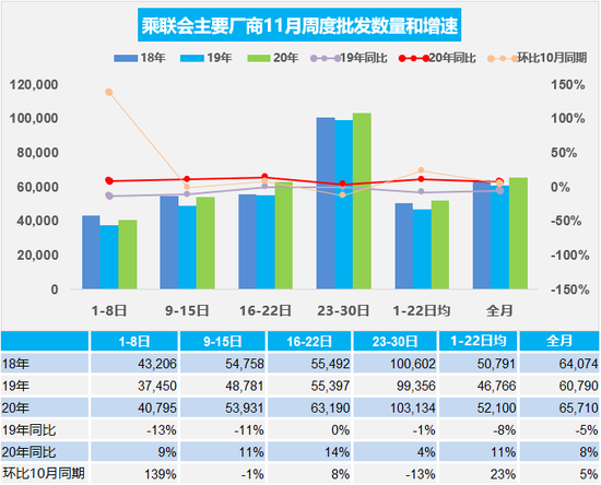 11月第三周主要厂商批发销量达到日均6.3万辆,同比增长14%,较2018年同期增长14%。环比10月第三周增长8%。