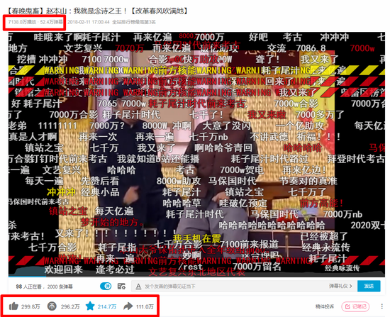 截至目前,由up主“小可儿”制作的“【春晚鬼畜】赵本山:我就是念诗之王!【改革春风吹满地】”视频播放量已达7142.8W,弹幕高达52.5W,投币296.2W,在“【猛男版】新宝岛”出现之前,长期霸占B站播放量榜首,当之无愧的镇站之宝,到今天为止也有不少用户“重温经典”。