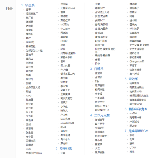 ▲“鬼畜全明星”的百度词条,分类多样、明确
