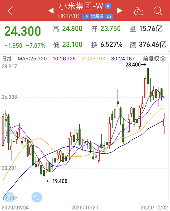 不过,从更长的历史区间来看,目前小米股价尚处于较高位,今年以来,该公司股价从10.86港元一路上涨,最高价超过28.4港元,至12月2日区间涨幅已经超过125%。